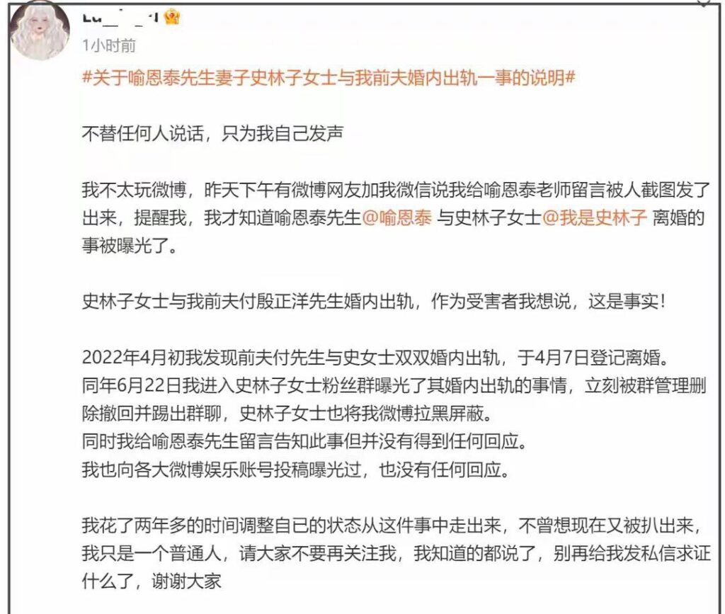 随后又被曝出,实际上喻恩泰妻子史林子早就出轨另一人,属于是二人双双出轨了。