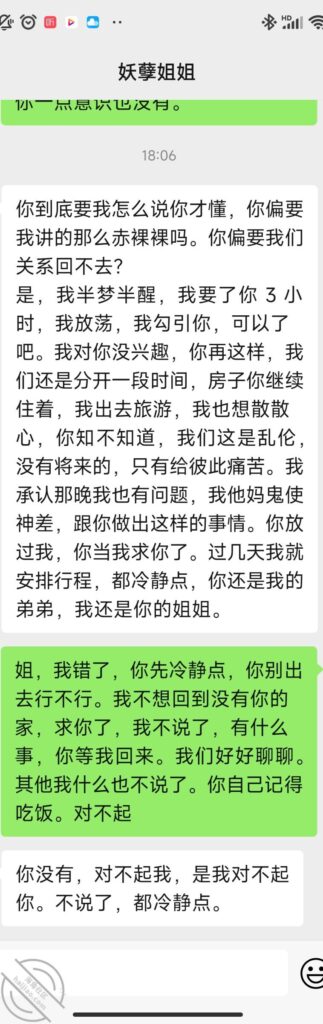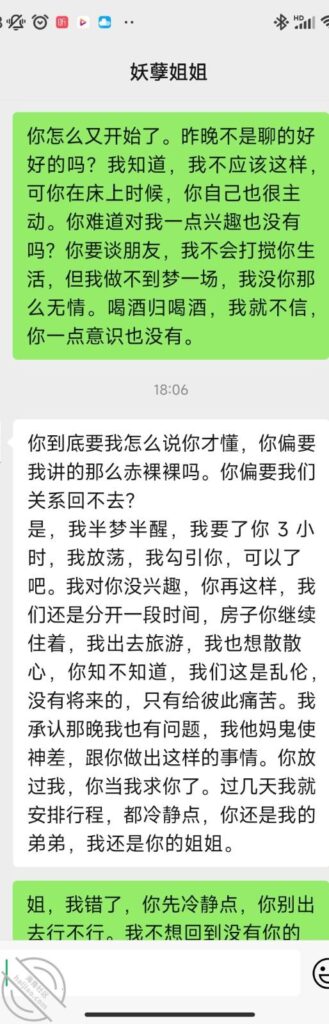 其实现在想想,昨晚两个人都是冲着这个目的去的,我也不知道我姐是什么时候对这个错乱关系不排斥的。很让我惊讶,只用三天就把我姐睡了,也真没谁了。
