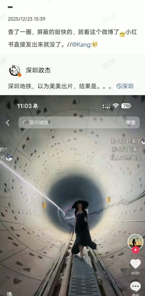 12月23日,深圳一处在建地铁隧道发生惊险一幕:一名女子未经许可擅自进入22号线施工隧道,在隧道内拍摄并将相关视频发布到短视频平台。
