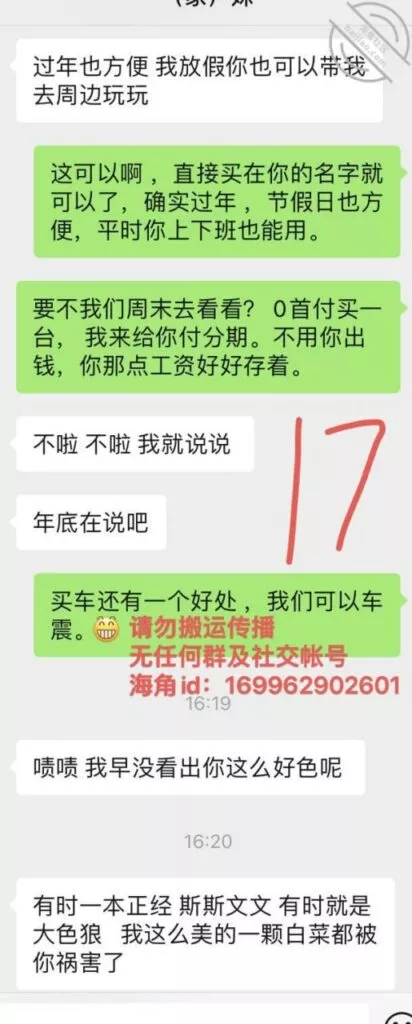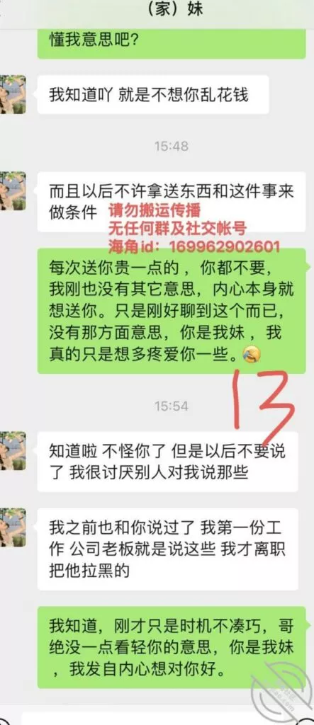当天还给我妹发了很多消息,内容很狗血,大致内容说他老婆不在身边, 夫妻间没什么感情了,看到我妹就忍不住想对她好。是发自内心喜欢我妹的,希望我妹能理解他,他为他下午的行为感到很抱歉,一时冲动然后保证以后不会这样了。让我妹不要生气。然后噼里啪啦的说了一堆,我妹不想理他,只回了他以后不要这样。他也算是了解我妹性格了,一看我妹这么回复直接就确认我妹不会闹的,然后又开始说是他的不对,问我妹喜欢什么,他买以表歉意,开始物质进攻,我妹不理他,就回了一句不需要,休息了,他直接微信转账1万给我妹,叫我妹收着,为他下午的行为真诚道歉,希望我妹收下原谅他这一次,其实按我分析他转这个钱目的意义并不是真心道歉,只是想试探我妹 加引诱女性的手段。