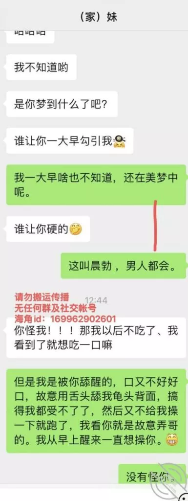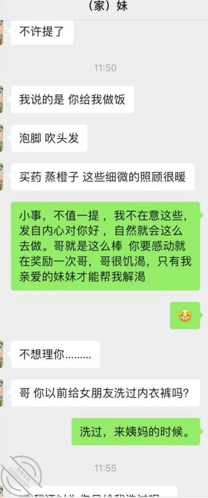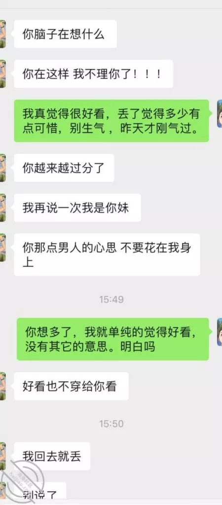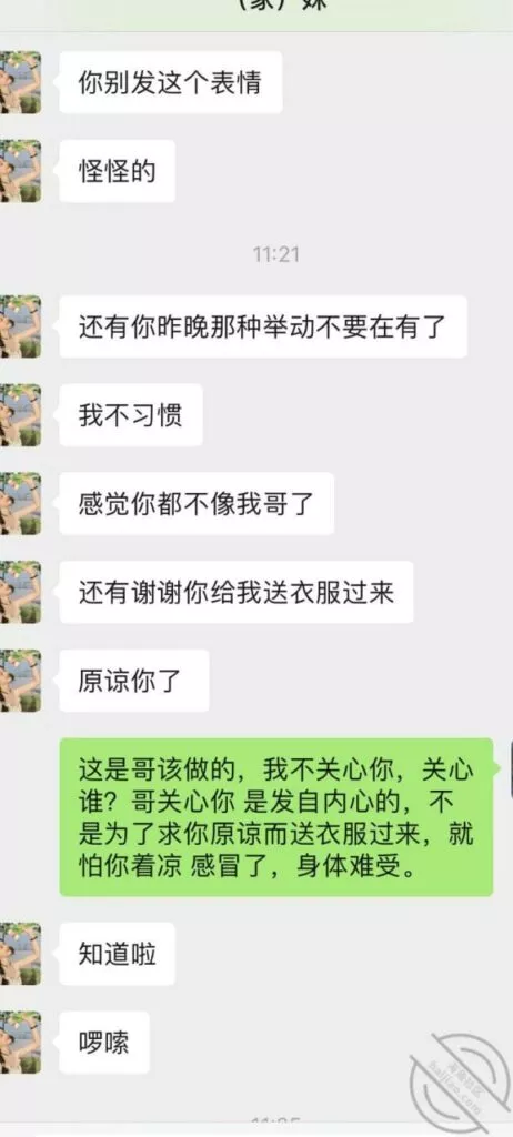 我和妹妹生活在南方的一个小城市,今天突然天气降温了,真是天助我也,早上我起来给我妹煮饺子,然后她去上班了 ,我看她没穿多少衣服 我就拿了件外套送到她公司,到了才跟她说 多少可能有点感动吧,女孩子嘛只要有人关心 这招都会很受用,然后我就走了,想一想我看这可是好兆头 然后微信上借着总结自己的错误同时又提昨天的事顺便把发现她情趣内衣的事也拿出来说了,哈哈 是不是有点得寸进尺 ,(详情见聊天记录)编辑帖子的时候她在回复我,后续有突破我在更新给各位。