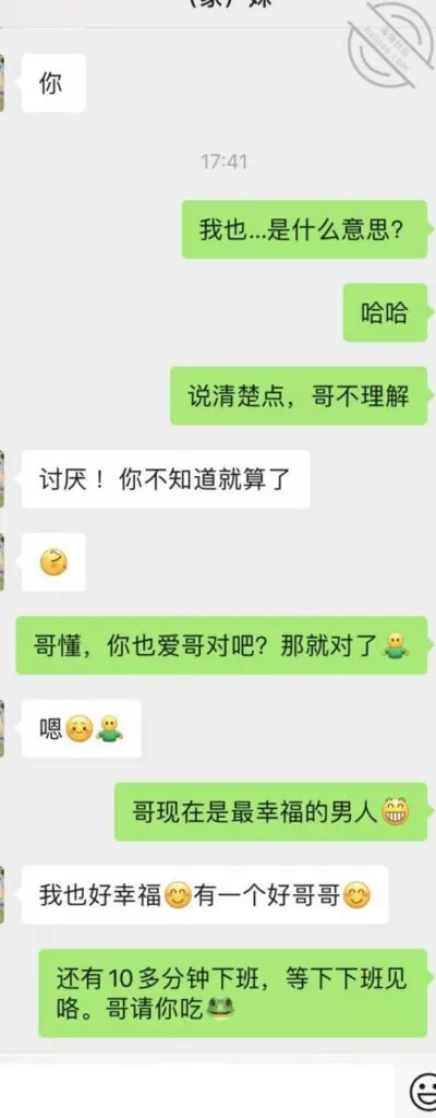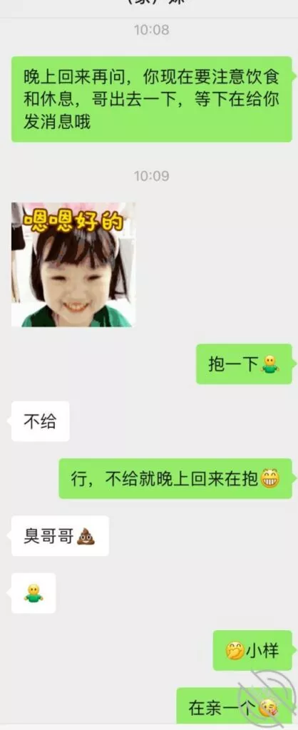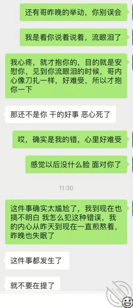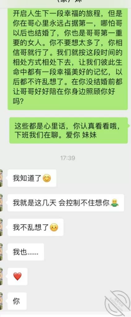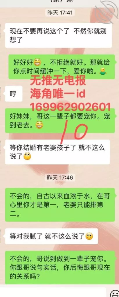 又会想到我的态度,这种相处的环境氛围会一直撩拨她的内心,久而久之我不信拿不下你。虽然没有直说不丢了,但是也默认了,她已经很清楚我对她来感觉了,纯兄妹情 彻底改变,对话里她潜意识已经没有叫我哥了,发了个抱抱表情给她肢体暗示 没骂我。