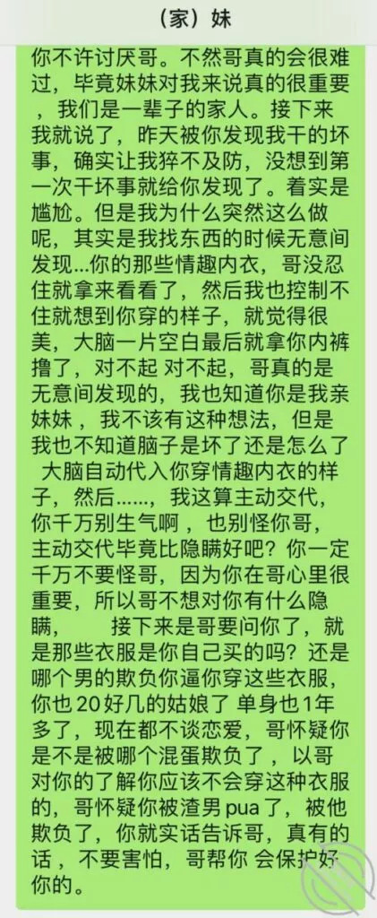 兄弟们,我又来了,今天上午面试回来,自从翻到妹妹的情趣内衣,当时惊呆了好几秒JB立马又竖起来了,兴奋的同时转念一想这不是好事吗?至少妹妹不是啥也不懂的小女生,至少在我之前也是被他前男友训练过会取悦她喜欢的男人的,想到这点让我信心大增(估计妹妹打死也想不到在她心里斯文懂事哥哥竟然会如此道貌岸然去翻她衣物)贴子里的好友兄弟给了我很好的建议,让我循序渐进的一步步来,第一步打开妹妹对我一直以来的认知,所以有了下面的犯罪过程,其实刚射完 贤者模式打开 满满的负罪感,瞬间脑海里就有挽救的想法。1:想把内裤丢了 ,这样妹妹大概率不会发现,等哪天发现不见了也只会认为晾晒的时候掉了,2:就是我用纸巾把内裤上的体液擦一擦 ,留点痕迹 把妹妹内裤放我床上,然后出门等她回来发现(因为我睡客厅,她一进门就能看到)等我妹责问我的时候 ,