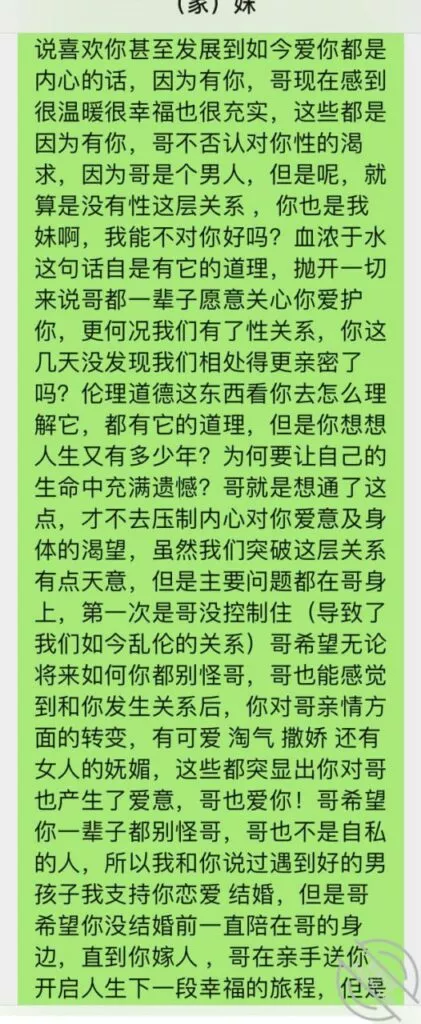 继今天下午和妹妹短暂交流过,妹妹6点半回到家里,面色平静并无什么表现。到饭点,我俩吃饭 期间我开了啤酒,本想要妹妹也喝一杯,妹妹不会喝酒说不喜欢那种味道,我也就不勉强,我就拼命夹菜给她献殷勤,虽然嘴上说不要,还没吃完,但是她笑了(笑起来真迷人) ,然后我就与妹妹东聊西聊 感觉她心情挺好的,我就按一个海友私信教我的说辞,我就看着她说妹妹,这两天发生的事 ,是有点突然,你看哥的秘密都给你知道了 ,我觉得咱们好像更亲密了?哥想你知道哥不会做伤害你的事,哥永远是这个世界上最疼爱你的哥哥,不管以后是我结婚了。还是你嫁人了。 这点哥都不会改变。你跟哥说说你的心里话 你现在心里怎么想哥的。怎么想就怎么说 。没关系,你只有说了,哥才知道你怎么想,哥才知道该怎么做,才能做得更好对吧?