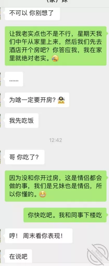 刚快12点的时候 ,我想起两秒的约定,我就找我妹,我说下午你答应我的事,能感觉到她有点娇羞,我没说:不要。