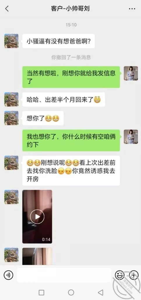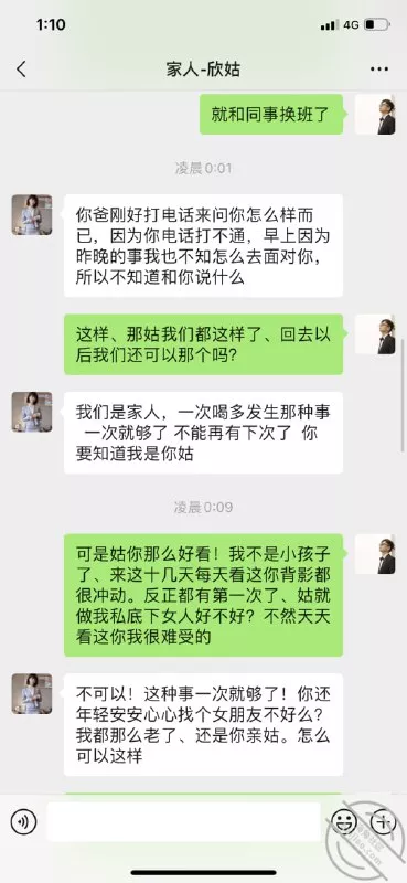 姑姑绝B搔B,昨晚喝醉三更半夜才回来。手机没拿上去就睡着了。记得以前拿她手机问过密码,尝试了一下还真打开了没改密码。翻看下她的聊天记录发现了不得了东西,手机上最少有四五个暧昧聊天对象.最牛B的是和一个小狼狗弟弟的聊天记录。真他娘的搔.看完聊天记录直接硬了起来真想上楼称她醉酒把她歼了。和人家发果聊还吃大JB的话语.还约了周四去打炮。观信息以前都是来她住的地方的,现在我来了影响到她了。我该不该找个借口说周四要上一天班然后半路偷偷杀回来呢??哈哈…想想都刺激。我把她的聊天记录的照片保存下来发给各位看这搔娘们。
