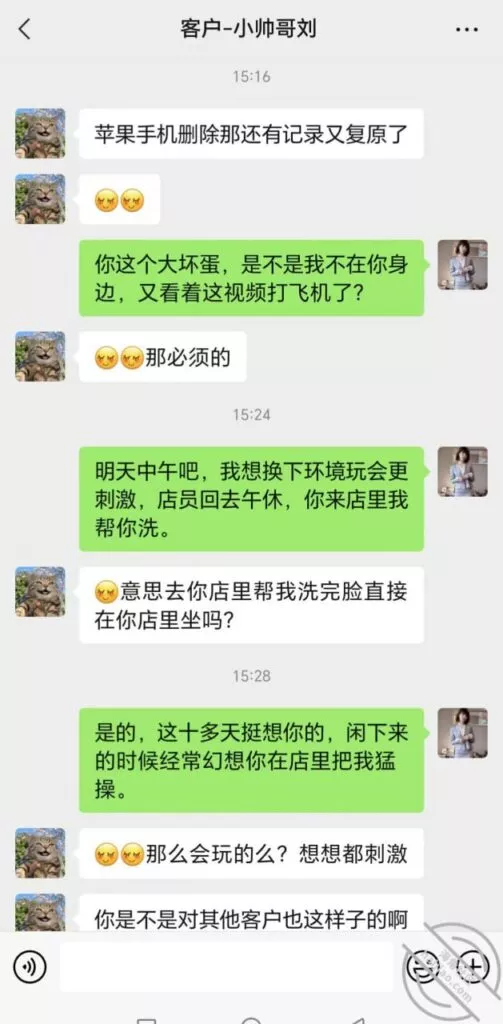 彻底毁三观啊!!想不到姑姑的炮友不止一个,连客户都有一腿。昨晚等她洗澡的时候偷拿手机翻她记录发现不止一个炮友。除了那小狗还有客户,都是年轻小伙子。昨天又约了个客户今天去她店里做,是不是做美容的离异少妇都那么搔的啊、??半个月前和别人做了还边做边拍视频。