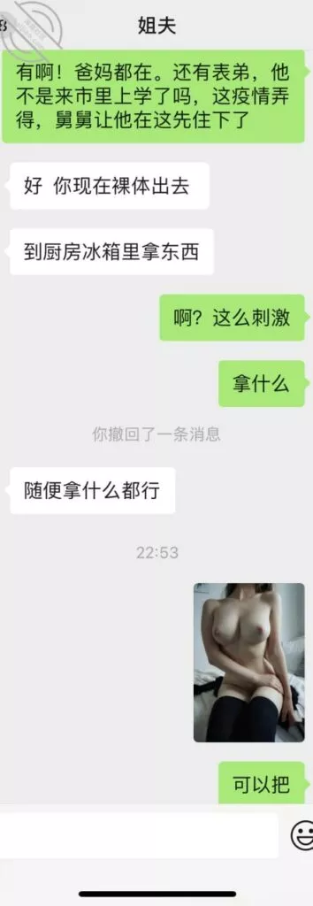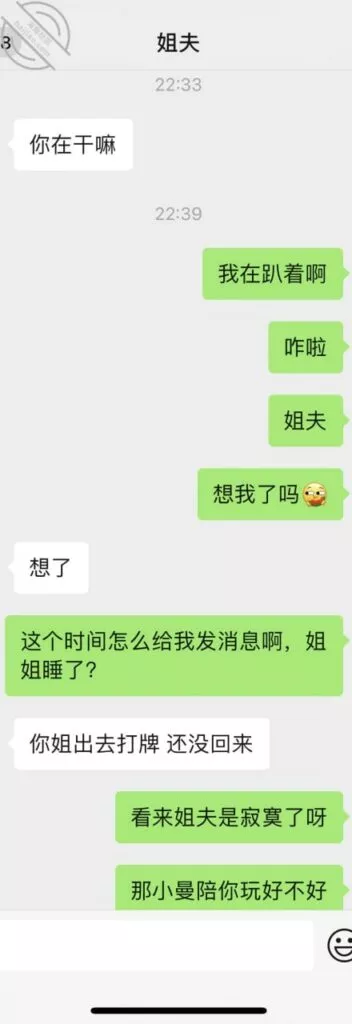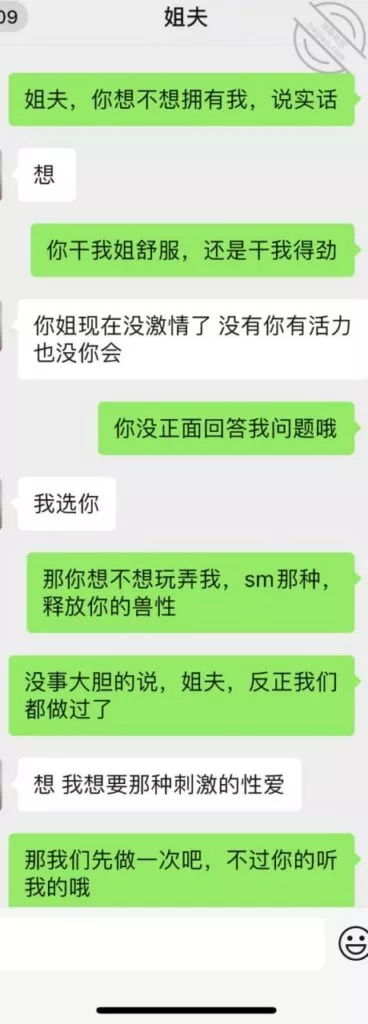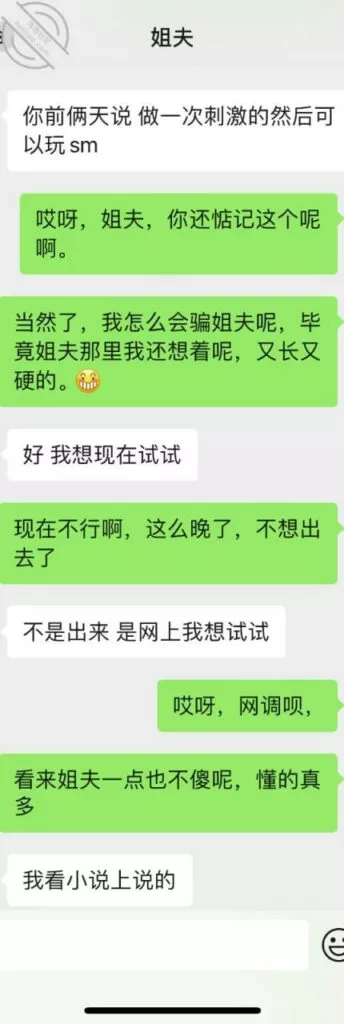 今天晚上姐夫突然发来消息,我以为姐姐睡着了,姐夫偷偷的给我消息,结果姐姐打牌还没回来,看来姐夫已经对我欲罢不能了,直接开门见山的说要玩我,并且在提sm,没想到平时老实的姐夫还是个闷搔型呢。
