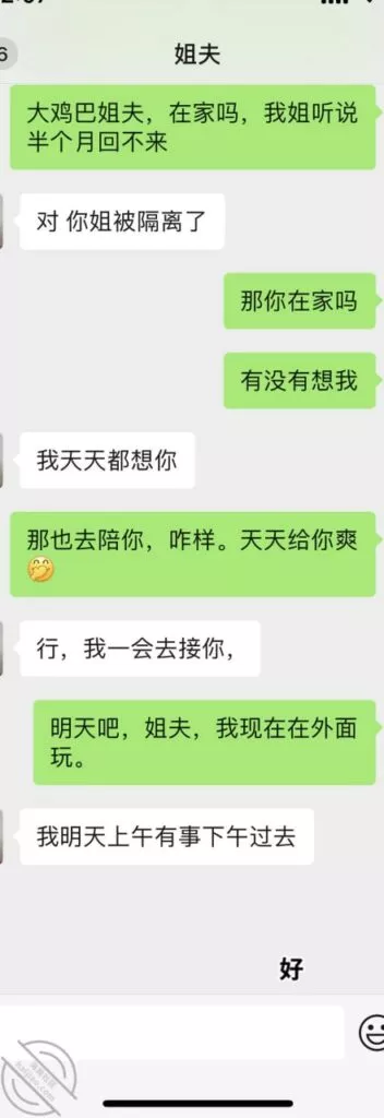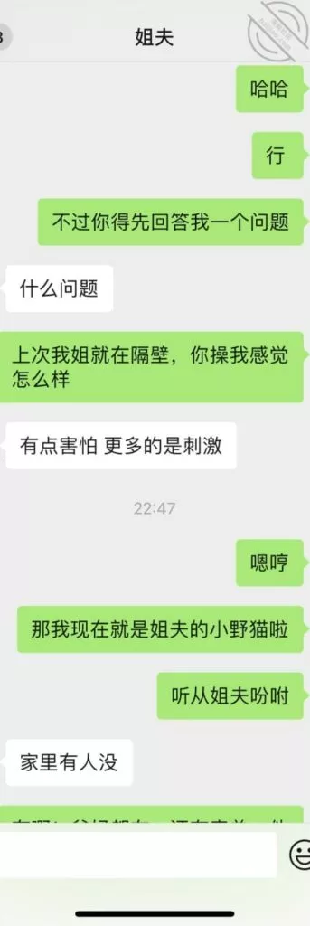 在瘙痒难耐的状态下挺而走险的给姐夫发了消息,看来姐夫也不是一窍不通吗,而且估计姐夫早就想睡我了,毕竟姐姐是那种强势的女人,跟姐夫简单的撩搔后姐夫决定这个周末好好的宠爱我!既兴奋又激动,好期待啊!也不知道这次要姐夫几次!想想又湿了。