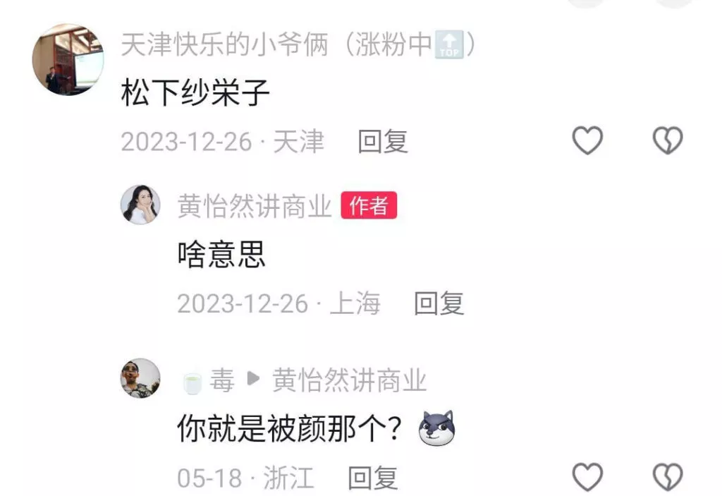 易参创始人、《怡然说》主持人黄怡然,视频中,黄怡然不仅全果出镜,还在镜头前表现出了极不符合公众形象的行为。她跪在地上,摆出了一副“母狗”的姿态,还被男主角射了一脸体液。令人更加震惊的是,黄怡然在被射中脸后,还魅惑地伸出舌头,舔舐着脸上的体液。