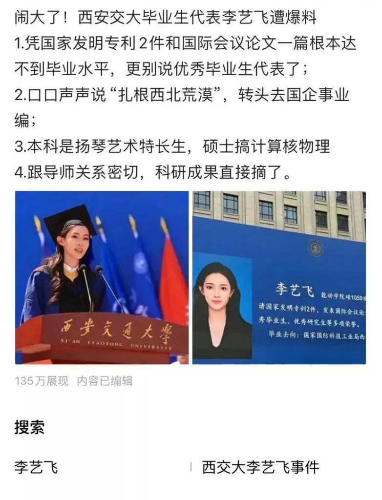 吃瓜🍉 西安交通大学学术妲己 李艺飞这次真是引发热议了。2024年,西安交通大学的研究生李艺飞作为毕业生代表在毕业典礼上发表演讲,却被曝光本科时主修扬琴专业,研究生阶段却转为计算机核物理专业。更令人震惊的是,她被指与该校导师存在不正当男女关系!