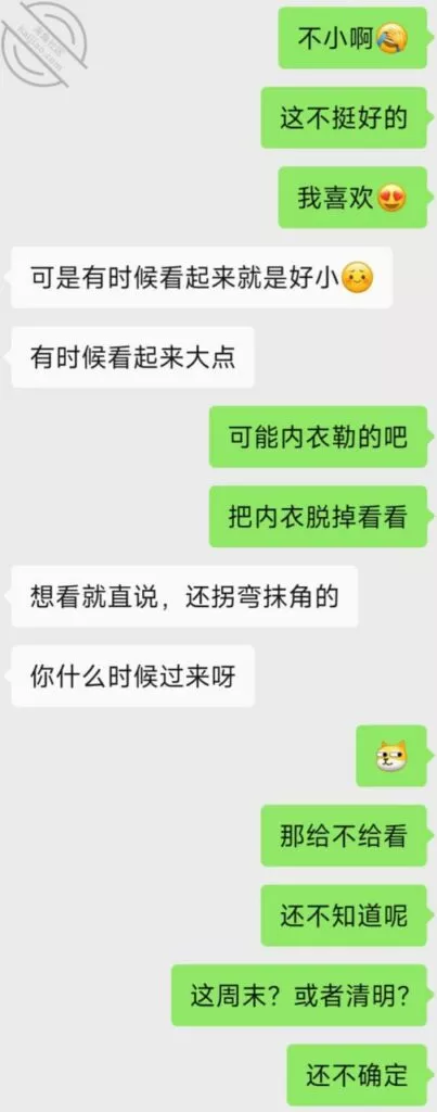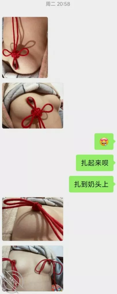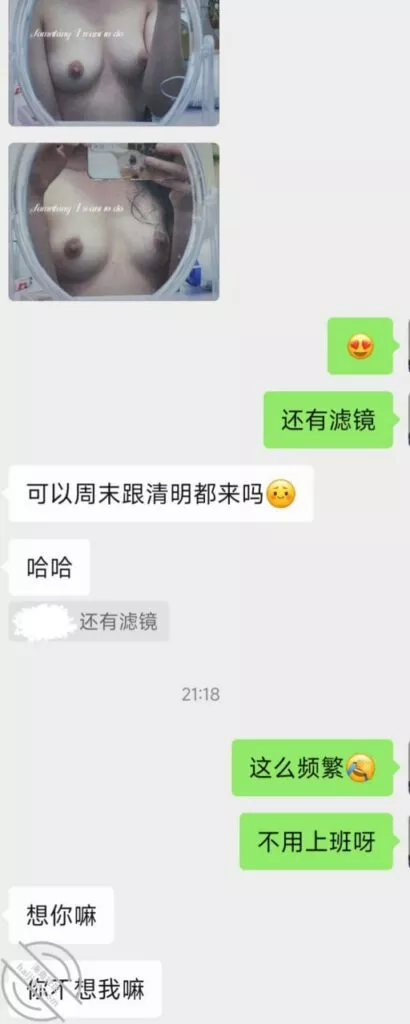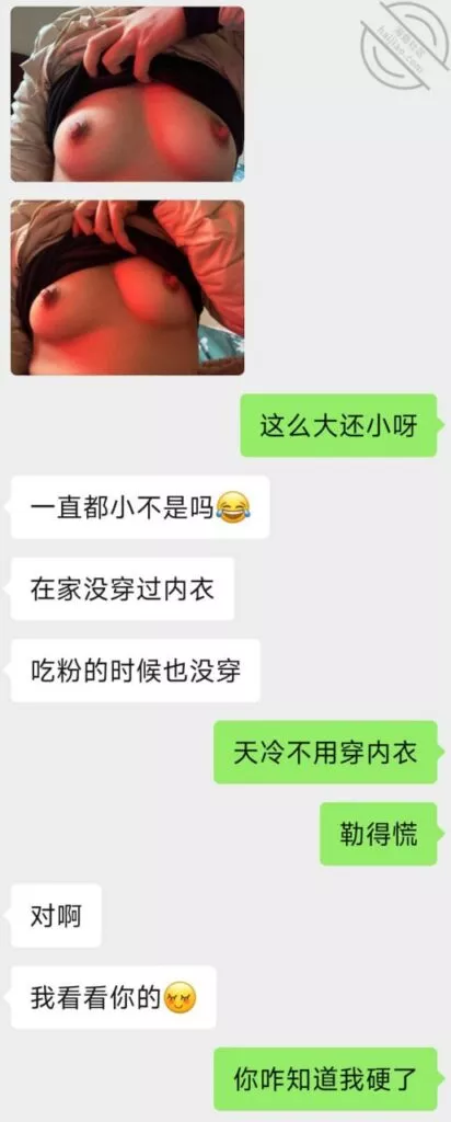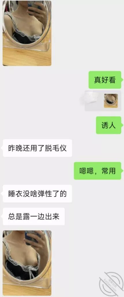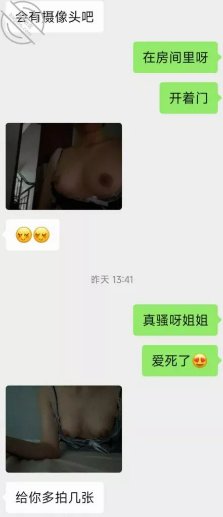 我就不多说啥了,直接上跟姐姐的聊天截图,可能是之前录视频的时候我跟姐姐说要发给别人看的,现在居然问我发给别人看会不会喜欢!!真搔!!可能姐姐猜到我会发一些不露脸的照片或视频分享给别人,她自己也觉得有点刺激吧(但是我可不敢跟她说我分享上海角了)还敢开着门露扔子拍照了,真的是越来越搔了,还好跟姐姐离得远,不然真的能被姐姐磨断腰!不过这照片真的是越看越喜欢,这小扔头看着就想吃!下周看看能不能约姐姐见面吧,一定得好好满足一下她!