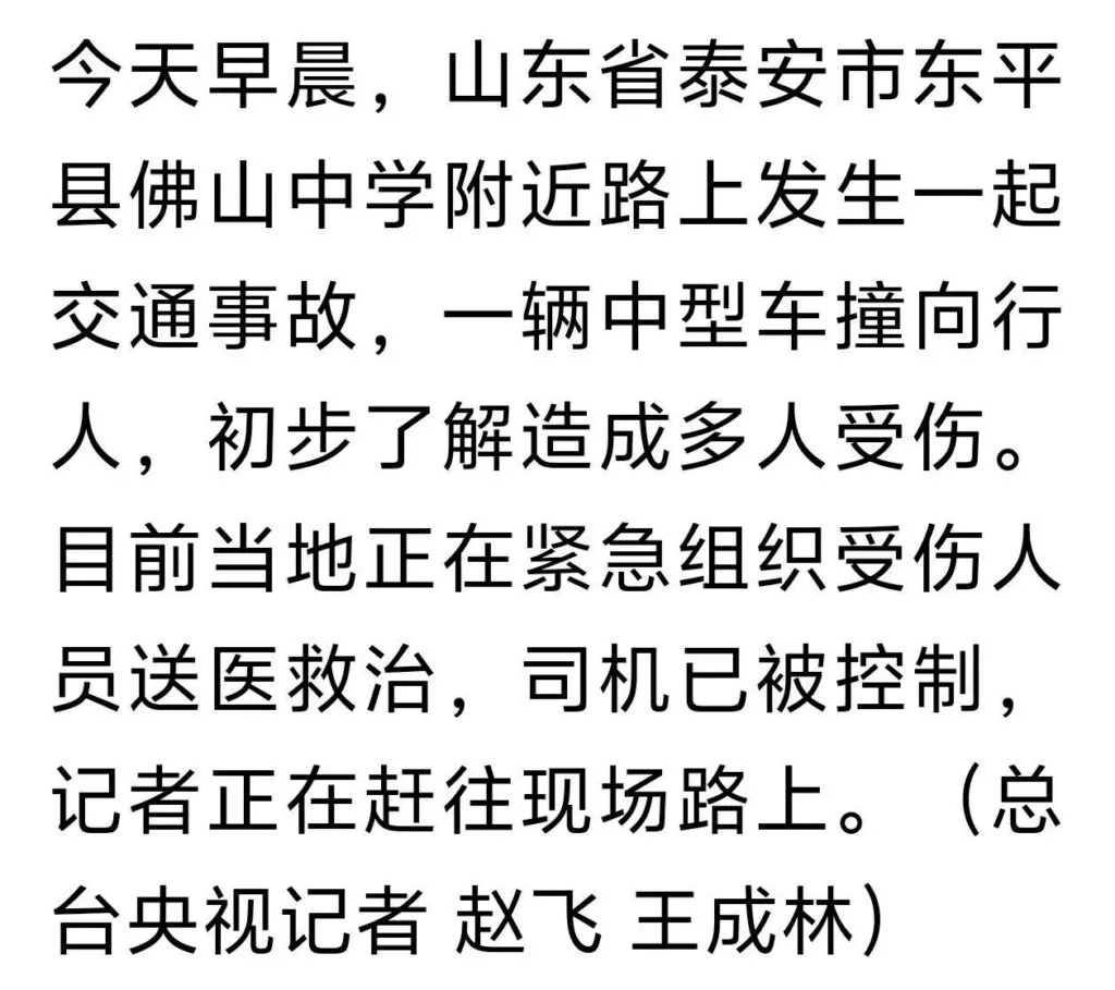 9月3日,山东泰安东平县。今晨,在佛山中学门口发生了一起严重的交通事故。一辆接送学生的定制公交车突然失控,冲入了正前往学校的学生人群。目前,事故造成十余名学生伤亡,具体情况正在进一步调查中。
