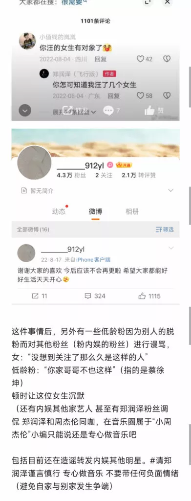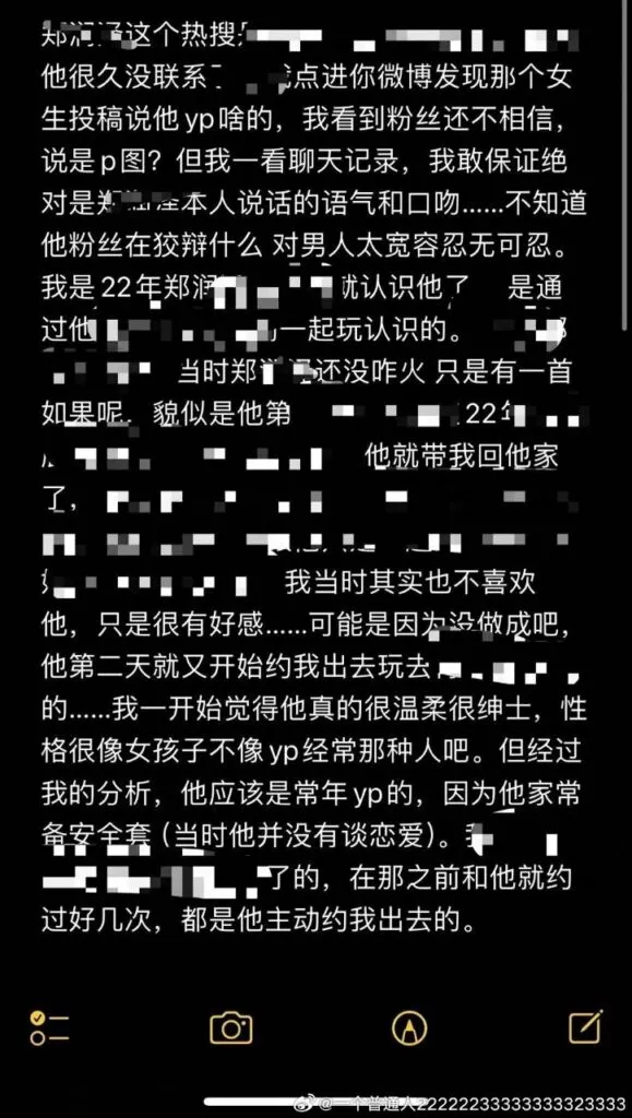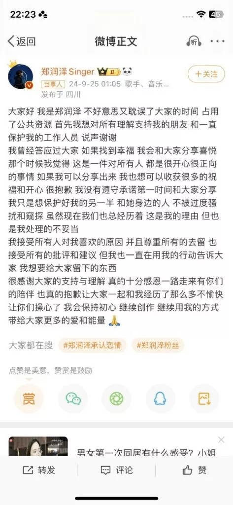 内地知名鲜肉歌手,网易云年中音乐榜单热度最高专辑打造者郑润泽,早上刚刚发布微博,官宣自己有了恋人,并且在文中描述为了保护另一半才一直没有宣布。没想到自己精心凹的人设还没到12小时,下午就被粉丝爆料私下约炮成瘾,塌房速度堪比光速。