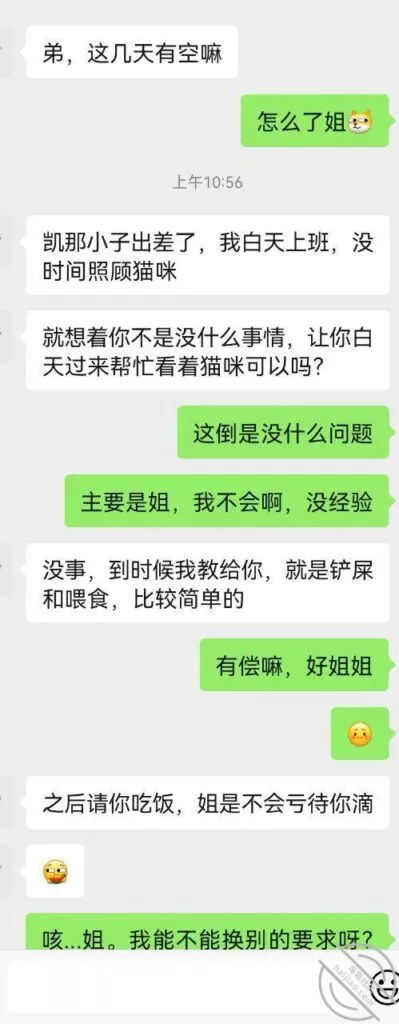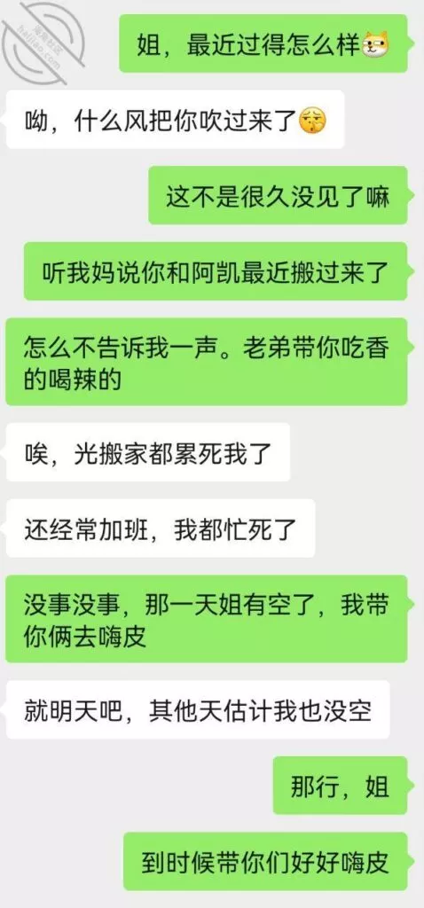 表姐和她对象搬来我所在的城市后,几乎没主动问候过我,连微信打声招呼都没有,我也是听我妈说的才知道他俩要搬过来,我想她可能是觉得我们太久没见面了,怕尴尬吧,不管怎样,始终姐弟一场,我决定主动找表姐叙叙旧