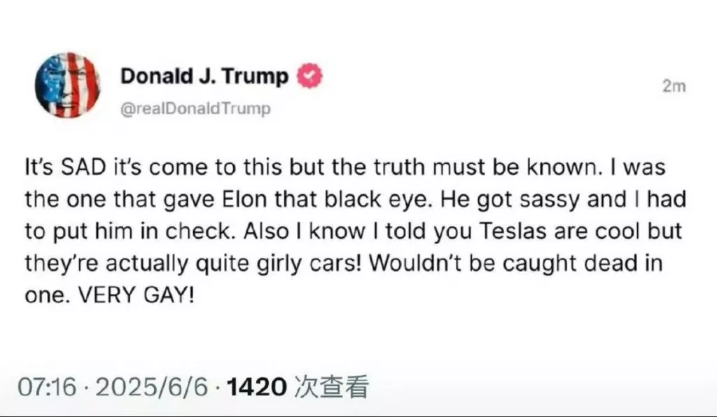 6月4日,马斯克反击,说自己在2024年大选时为特朗普砸了2.5亿美元,现在被翻脸不认人。他还抛出更猛的料,暗示特朗普和爱泼斯坦有染(性犯罪者杰弗里·爱泼斯坦相关的档案,暗示特朗普涉及其中。就是那个做i岛,自行搜索吧。),甚至喊话国会弹劾。