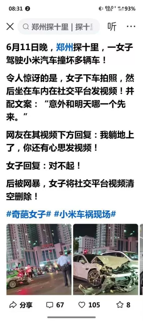 我还躺着呢你还有心思发抖音?郑州探十里小米su7撞车女司机先发抖音