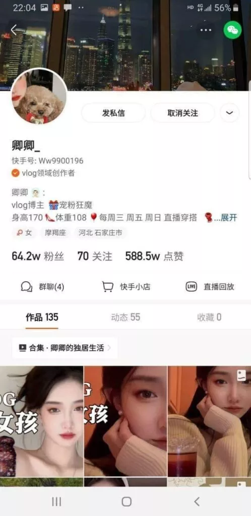 快手上拥有64万粉丝的高颜值主播卿卿,原本以清纯形象受到欢迎,如今却因与他人合拍的大尺度视频而形象崩塌。她不仅因这些视频被曝光,令人震惊的是,甚至还在私下里谋取金钱。