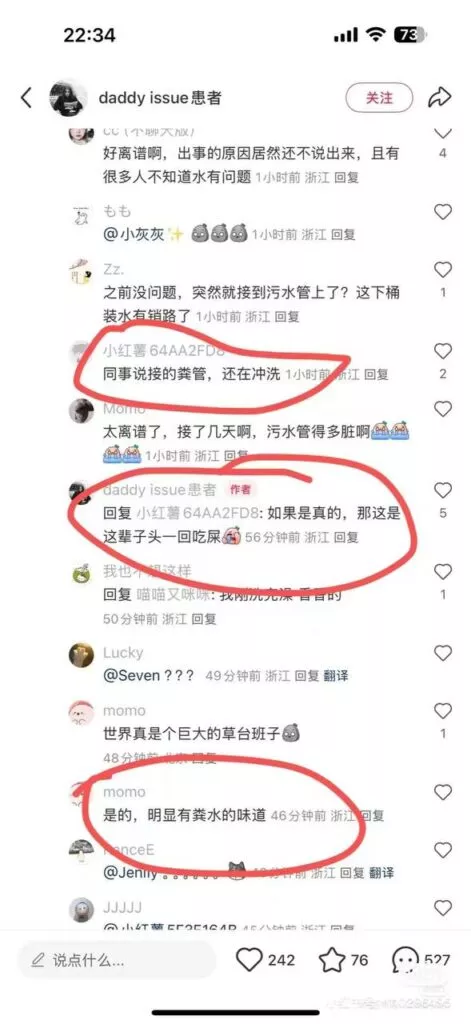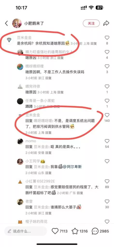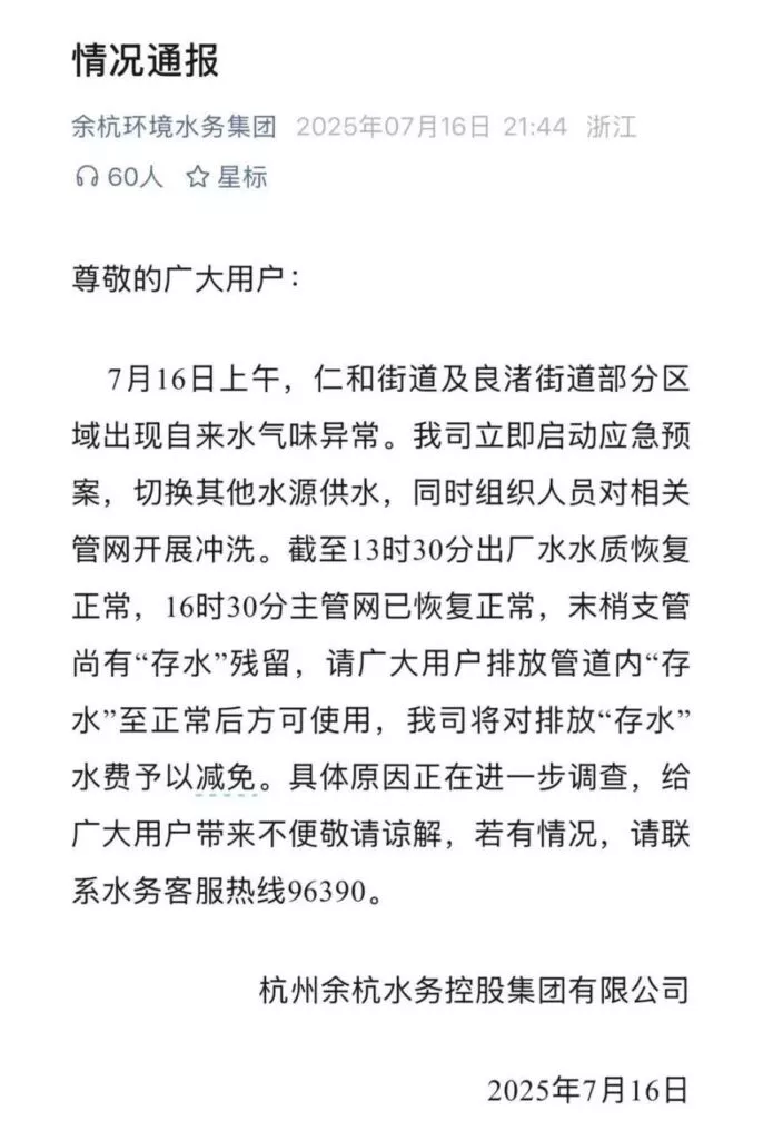 浙江杭州,许多市民反映,部分小区的自来水散发异味,无法正常使用,导致许多人不得不外出购买饮用水。仁和街道和良渚街道的一些区域自来水的气味异常。根据消息显示,似乎是工作人员错误地将排污管接入了生活用水系统。