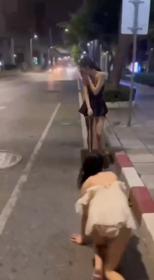 晚睡还有惊喜?深夜广东街头惊现sm圈大佬户外训练,一名身穿黑色短裙的女子牵着一名穿着白色短裙的女子在街头行走,路过的摩托车小哥都快看呆了。