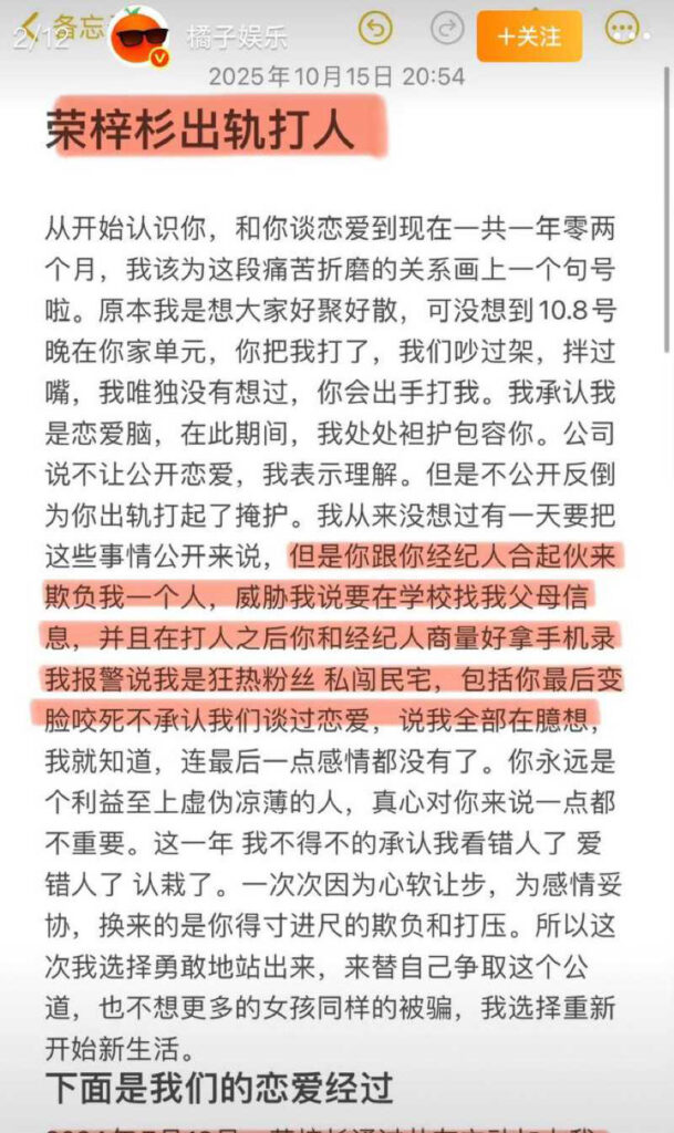 19岁走红童星荣梓杉,近日被其女友李禹熹在社交平台发文指控涉嫌出轨与家暴。此事迅速引发舆论关注,曾塑造的公众形象也因此面临严重质疑。