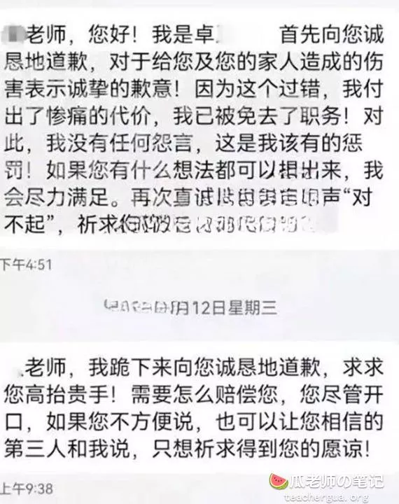 事件发生第二天,丁阿姨向当地教育局及学院党委进行了举报,希望得到正面的裁决和答复随即卓处长被免职,并且低声下气的向丁阿姨的儿子进行郑重道歉