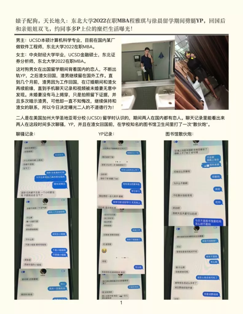 这个瓜看似很乱,但其实也就那么回事,渣男徐辰和渣女程雅琪都是UCSD的留学生,程雅琪受到母校财经大学的邀请参加2022年的新生指南直播讲解,渣男想玩刺激的,就在直播过程中和程雅琪doi,可能是因为动作过于激烈或者主持人的Cao作,不小心打开了摄像头,两位的不雅行为被全程直播并且被观众录了下来。男主来自郑州大学,很巧合的被同校友认出,发给了渣男的正牌女友。