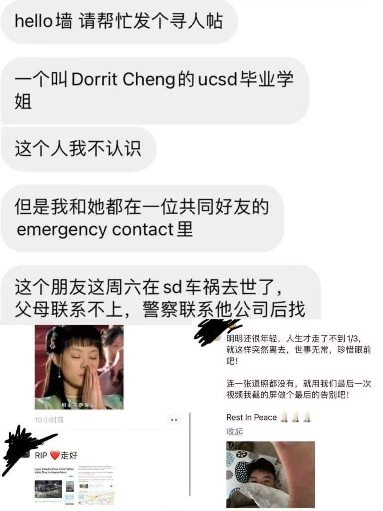 UCSD的留学生按照学校要求需要留下一个紧急联系人方式,在失联时备用。而近期在UCSD留学圈中,有几位留学生在高速行驶遭遇车祸身亡失联,当地警方根据紧急联系人居然联系到了Dorrit cheng也就是2022年财经大学新生指南门事件的女主角程雅琪以及另一位紧急联系人