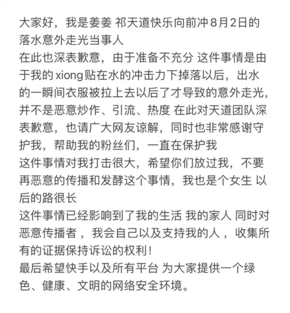 快乐向前冲因一起曝光事件再次登上热搜。8月2日,小网红姜姜在参加节目时遭遇关卡失败,不慎落水。由于冲击,她的衣物发生了曝光。为此,她在自己的社交媒体账号上迅速发布了澄清视频,强调这一事件并非出于故意。